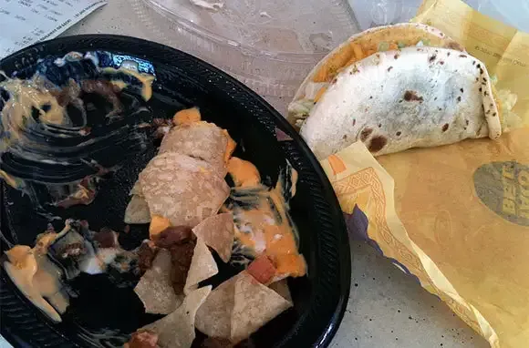 Stress can cause heartburn, so if you're a nervous flyer or worried about delays, you're already at risk for acid reflux. Don't make it worse by ordering Taco Bell's Volcano Nachos. Not only will the spicy "cheesy molten hot lava sauce" and jalapenos contribute to your heartburn, the nachos are also topped with beans, whose famous gas-causing effect only gets worse in the sky. The dish's 990 calories, 59 grams of fat, and 1,840 mg of sodium certainly won't do you any nutritional favors either.