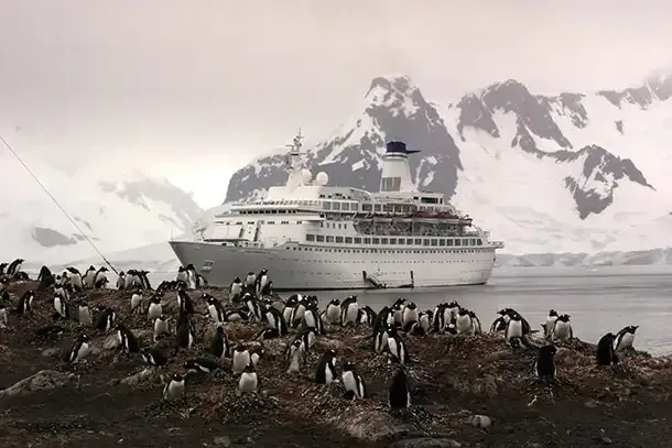 (Photo: Penguins with Cruise Ship in Background via Shutterstock)