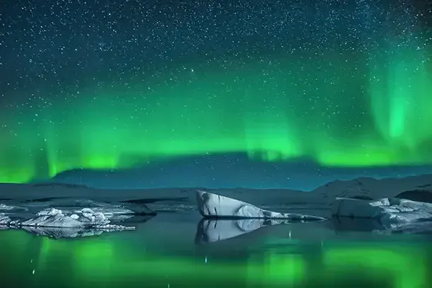 RELATED:What It's Really Like to Sleep in a Snow Hotel(Photo: Icebergs Under Northern Lights via Shutterstock)