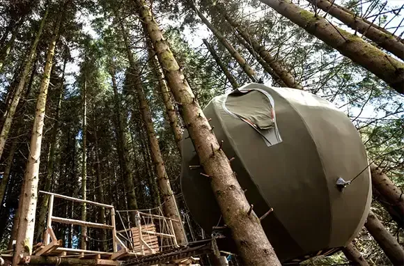 What We Love: This middle-of-the-forest tree-house tent with an ingenious rigging system is like something you'd read about in The Hunger Games. While the outside has a post-apocalyptic utilitarian feel, the inside is luxurious, with a log-burning stove and a double bed that converts into a couch. Charge your electronics at the desk's power outlet and change the mood by dimming the lights. There's a flushable toilet, sink, and gas-powered shower outside the tent. After a day of exploring the vast woods, you can watch the sun set as you sit around the fire pit built into a deck near the stream.