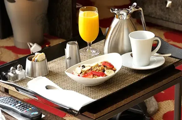 Work-Around: Lots of hotels now allow outside restaurants to deliver to hotel guest rooms. In fact, many hotels leave menus or information about nearby places that deliver in the guest information books. This works best if you like pizza or Chinese.