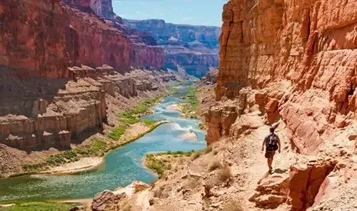 From the rim, you see the top half, and from a raft on the Colorado, you see the bottom half. But the only way to truly appreciate the Grand Canyon’s grandeur is the rim-to-river hike, a descent of about 5,000 feet. Thought that hiking downhill was easier? The 7.3-mile South Kaibab Trail proves otherwise. But, you’ll pass through a multi-colored rift etched by prehistoric river currents on a trail originally forged by Hopi Indians. Every switchback presents a chance to catch wildlife and a different soaring panorama. South Kaibab offers the shortest route, taking anywhere from three to five hours, while the Bright Angel Trail is more gradual and less exposed but 10.3 miles. Rest for the night in a rustic stone cabin at the Phantom Ranch (reservations open 13 months ahead) before you hike out in the morning.