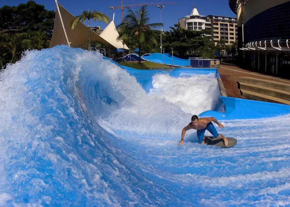 You may have spotted flowboarding while on a cruise ship or at a waterpark, or maybe just entertained yourself by watching flowboard wipeout montages. Flowboarding is basically surfing on fake, stationary waves in a small space. The waves don't move forward, so riders can perform tricks and jumps without needing much room—or just desperately try to stay upright, as is the case for most people.