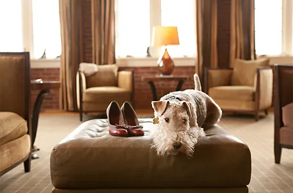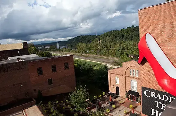 Paying homage to its origins, Craddock Terry Hotel puts its best foot forward with whimsical shoe-related references throughout the historic factory building. On display in the lobby are the leather lace-up boots that were popular during the shoe factory's heyday. There are also historical photos, company checks, and the special coins used by employees for lunch in the cafeteria. The footwear theme carries over to the guest room's door signs, each one a different shoe-shaped silhouette. Free continental breakfast is served in an old-fashioned wooden shoe-shine box. And if your shoes need buffing, shoe-shine service is available. When you're ready to see the town, the hotel dog, Buster Brown, will show you around.