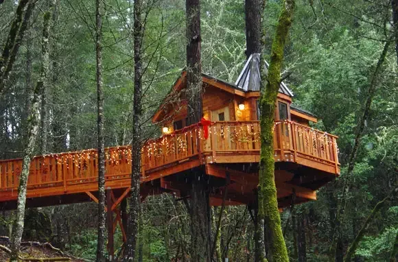 Revisit your childhood dream, or just prepare to get super cozy at Vertical Horizons Treehouse Paradise in Cave Junction, Oregon. The property features three houses, each with a unique theme. Organic fruit and local products are used in each morning's breakfast, which is delivered directly to your tree house with the Winter Nesting Packages. If you're looking for leaf-peeping opportunities, fall is the perfect time to sleep amongst the leaves and wake up to the sun lighting up the red, orange, and golden leaves. Recreational technical tree climbing is available for guests who want to monkey around; while horseshoes, fishing, disc golf, and a swimming pool are available during summer months. Rates begin at $200 in the winter and $225 in the summer.