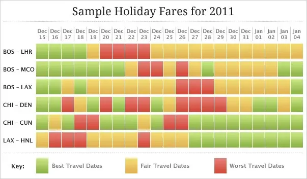Priceline's data is based on average fares across a large number of air routes. And, given the adage that "A statistician is someone who drowns while trying to wade a river that averages three feet deep," averages do not necessarily reflect conditions on any individual trip. Accordingly, we looked at six individual routes running a gamut of destinations and lengths: Boston-London, Boston-Orlando, Boston-Los Angeles, Chicago-Denver, Chicago-Cancun, and Los Angeles-Honolulu, for departures December 15 through January 4. We checked the best fares by originating date, with return dates in mid-January, enough later to avoid any holiday distortions, and the results showed more variation than consistency: