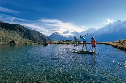 If you're up for splurging on an international getaway, what better place to cool down your summer than by an alpine lake such as Kreuzboden, in the Swiss canton of Valais? An aerial tram transports visitors from the train station below, up to almost 8,000 feet where the lake lies. It's an ideal spot from which to explore the many hiking trails, and children will find plenty to occupy their time at Hohsi-Land, which has a playground, petting zoo, water park, and themed trail.