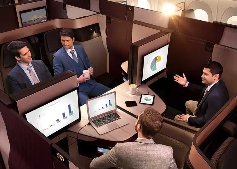 At a few thousand dollars per seat, you have no excuse not to work if your company is financing your business-class ticket on Qatar Airways. The airline’s Business Class Q-Suites offer groups of four seats (two forward-facing and two aft-facing) that can be combined into a flying conference room, with media panels in between to display your exciting PowerPoint presentations.
