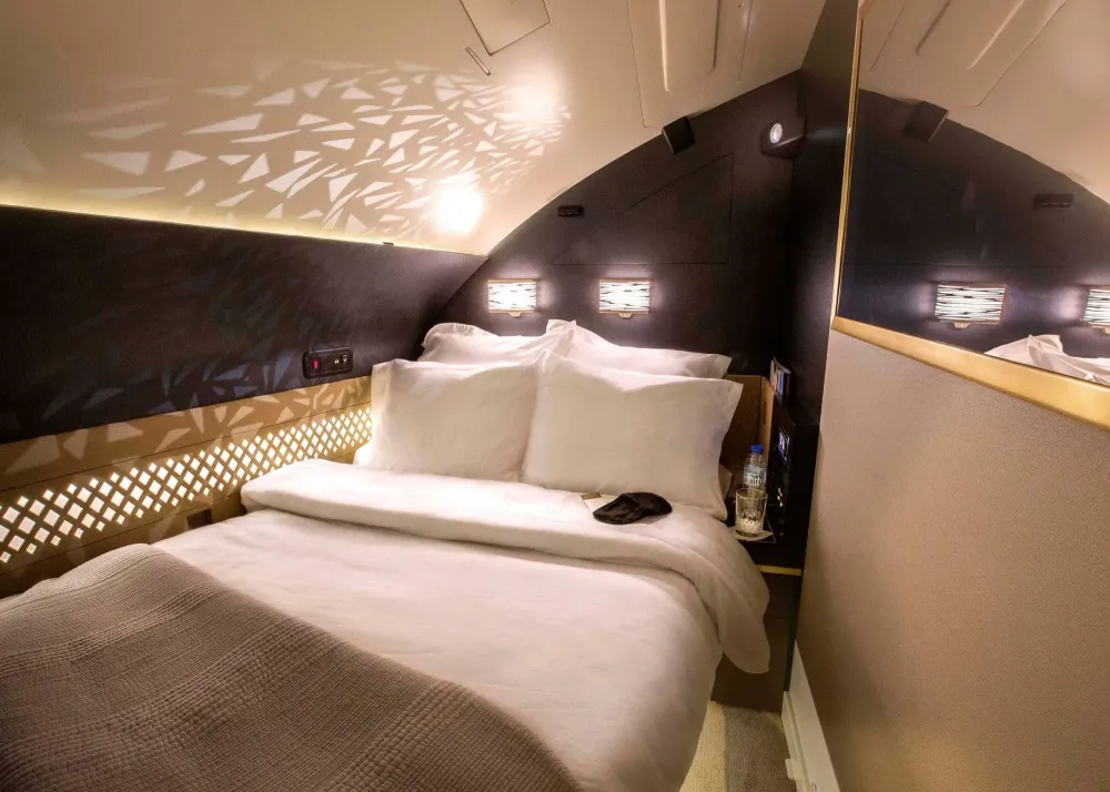 The Etihad Airways’Residence might be bigger than your hotel room, but I’d say if you’re paying approximately $30,000 for a one-way ticket, you’re probably not booking a tiny motel room on the ground. Book this flying suite for yourself and a guest, and you two can enjoy your own personal living room, divided bedroom, and ensuite shower room. The living room has a leather sofa and two dining tables for relaxing or eating in front of your 32-inch flat-screen television, and the bedroom has a 6-foot 10-inch double bed that’s made up with designer Italian linens. The bedroom also has its own 27-inch flat-screen television so you can watch a movie as you fall asleep.