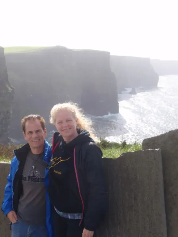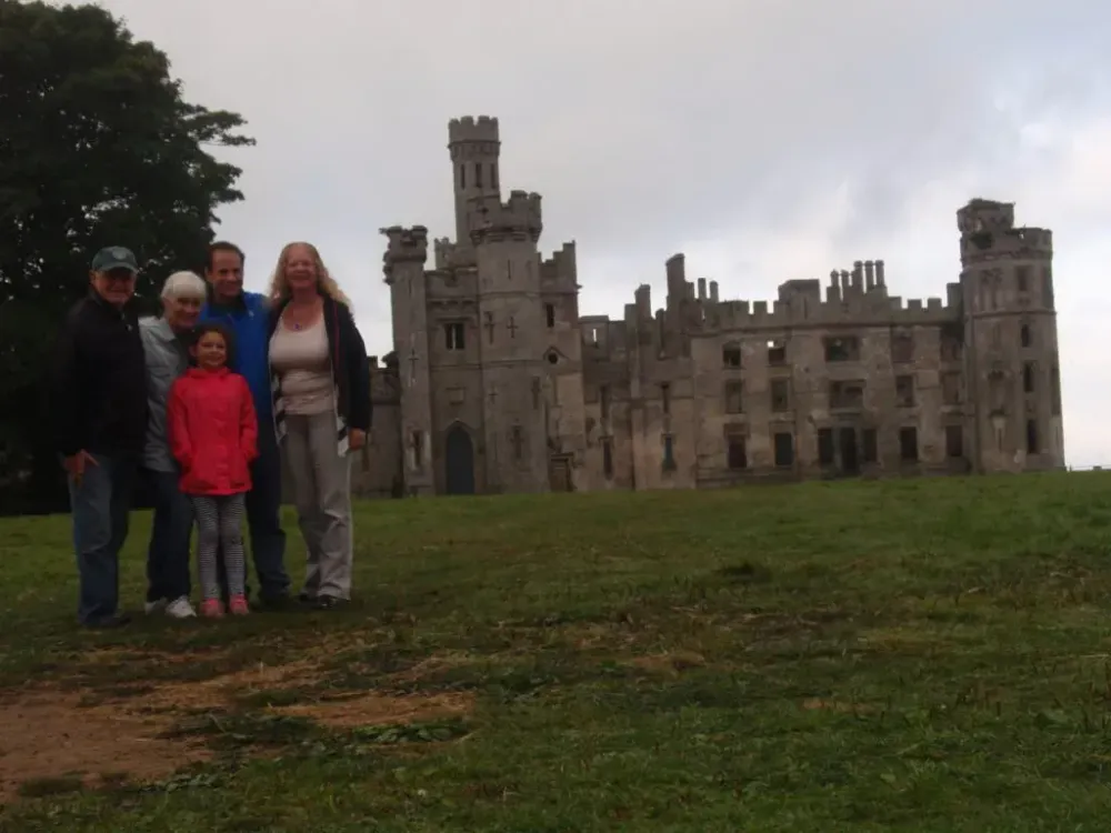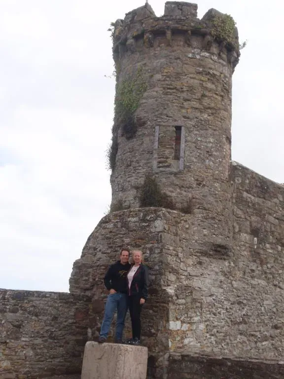 Monday September 28 – Up early and breakfast at 8am, we both had pancakes. Next we headed off to Duckett's Grove Castle. We learned of this castle from the TV show, “Destination Truth - Banshees of Ireland”. We put it on our itinerary even though we didn’t expect to see much there. It turned out to be much more impressive than we had thought. A very large unique castle with lots of crosses in the walls and other interesting aspects, but we did not see any banshees. After this we headed into County Wicklow and came upon a surprise town, Hollywood, Ireland. Next we passed through the Wicklow Gap which had very interesting landscape and a beautiful valley. Beyond this we arrived at Glendalough Round Tower & Monastery. We could not go up in the tower but it too was very interesting with a lot of graves all around the grounds. Next we drove to Powerscourt Falls. Lovely waterfall and John & Zia walked out on the rocks to just near the falls. We shared some snacks and Zia dragged John to all the kiddie playground equipment. After this we headed back to County Dublin and our second castle stay at the Fitzpatrick Castle Hotel. We went to dinner at The Club Bar in the local town of Dalkey. Another good, fun pub. Sadly this is our last day of the trip, so back to our room to relax and pack for our flight home tomorrow. But it has been a lot of fun!!!