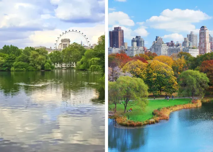 Both London and New York do "urban oasis" well. But only London's parks have lounge chairs to rent, ponds that you can swim in, beaches, and a professional outdoor theater.
