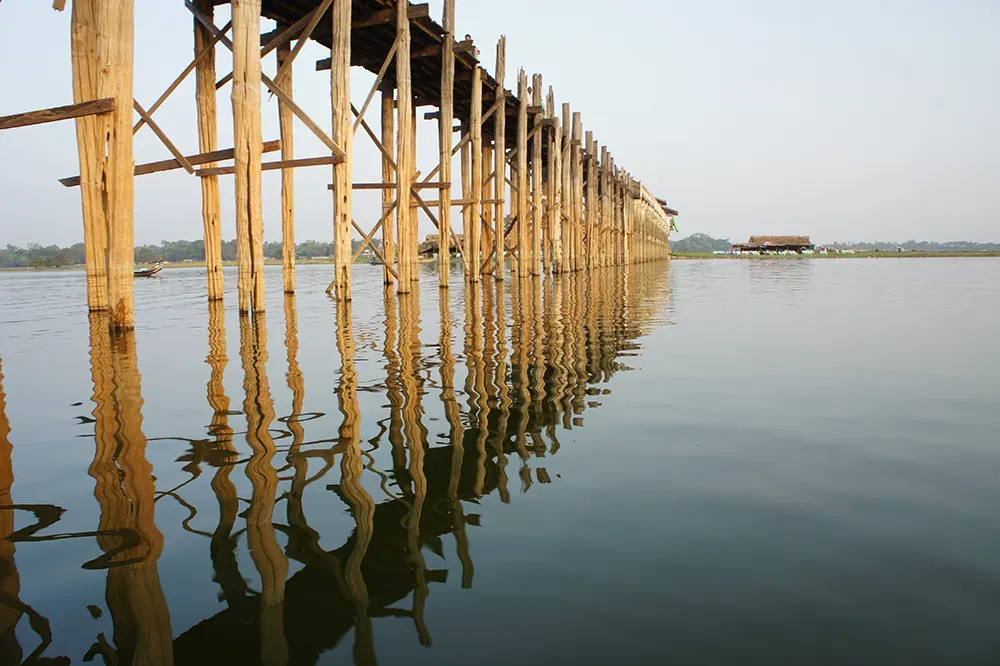 We're far enough from Myanmar's famous U Bein Bridge to be removed from the sounds of conversation, but still close enough to catch the silhouettes of kids on bikes, young women peddling necklaces, and old astrologers telling fortunes—all of them caught against the brilliant orange sun as it sinks behind the old teak boards of the bridge.