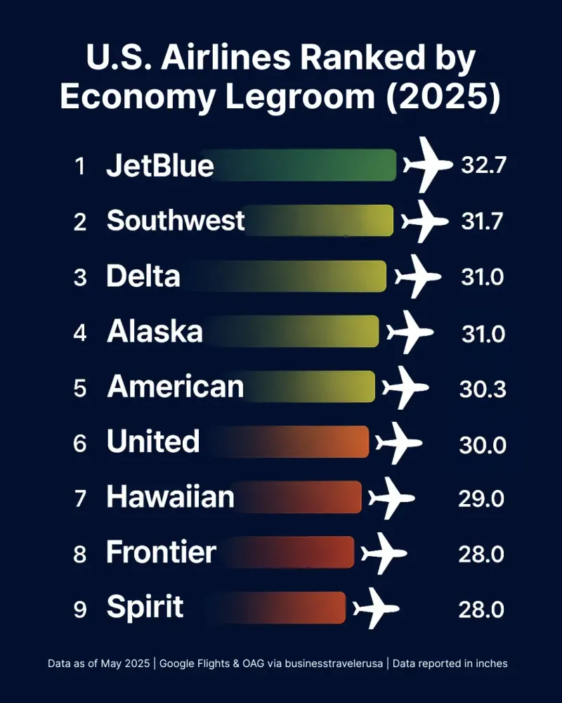 Business Insider, using stats on the ten busiest flight routes of 2024 from aviation data company OAG, calculated the top airlines for legroom in 2025. The study looked at economy class across nine carriers and found a difference of more than five inches between the most and least generous seat pitch.