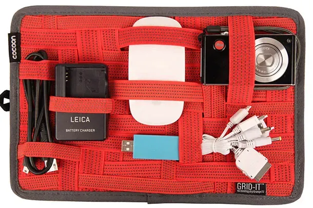 made from rubberised elastic bands. Tuck electronic devices, wires and plugs into the unique weave design to save you scrambling for that vital gizmo at the bottom of your case.