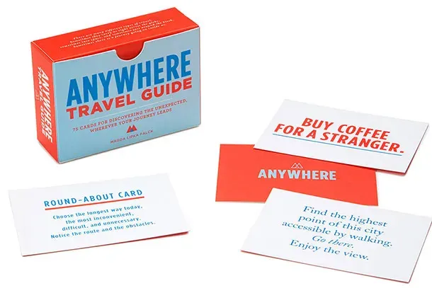 . The 75 cards feature quirky prompts including 'walk down the street in a strange way' and 'buy a coffee for a stranger'.