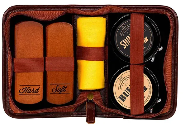 for jetsetting gents. The leather-effect canvas case contains two tins of polish, two brushes and a cloth so you can clean, shine and buff your shoes.
