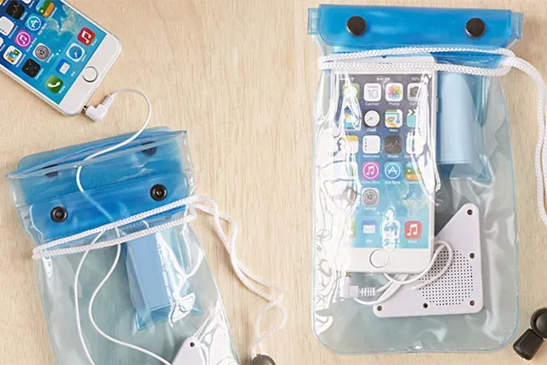 from Urban Outfitters. The transparent pouch features a built-in speaker and lets you stash any device with a headphone jack inside.