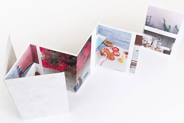 from Parabo Press. Use the App to upload 14 of shots from your iPhone and select a mix of landscape, portrait and square prints to create an accordion-style pull-out album. The marble-effect cover can be customized with a gold foil title of your choice.