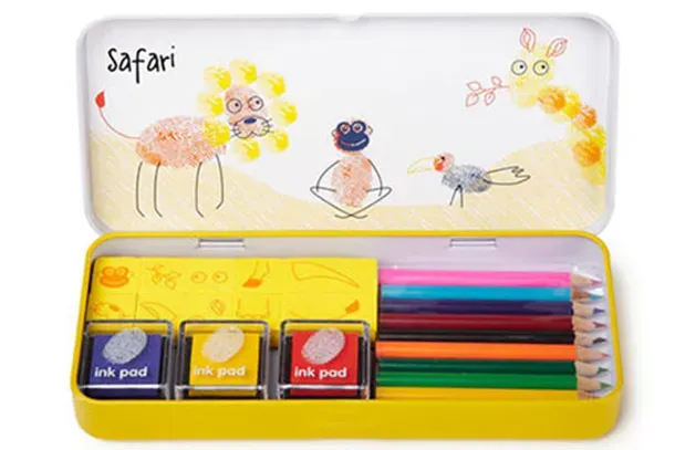 that includes ink pads, rubber stamps and colored pencils to create fun safari animals.