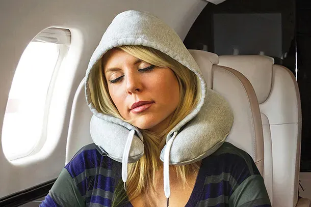 is the stuff of your in-flight dreams. Made from super soft fleece, this snooze aid combines a memory foam pillow and an oversized sweater-style hood designed to help block out light and sound.