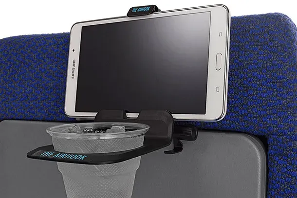 , a handy contraption that hooks onto the seat in front of you to hold your electronic device and drink in place. Keep the tray table in its locked position and secure your iPhones or tablet (up to 8 inches tall) for a better viewing position at eye level.