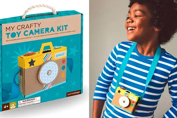 lets kiddos build their own toy camera, complete with stickers, ribbons and draw-on cardboard.