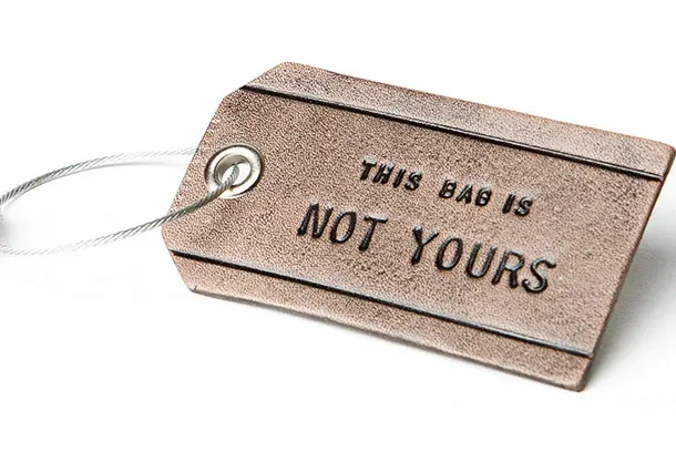 from Brooklyn-based Owen & Fred. Hand-dyed and hand-stamped in the U.S., the customized tags come with a stainless steel clasp to add a little character to your carry-on.