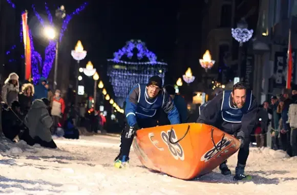 The perennial heavyweight, Quebec Winter Carnival bills itself as the world's largest winter festival. It's best known for its life-sized ice palace, its snow sculptures, and its snowman mascot, but Winter Carnival has a wild streak, too. In the extreme canoe race, paddlers navigate the frozen St. Lawrence River's snow and ice obstacles. For sports fans, there's a horse derby on snow and a hysterical human-sized foosball game where players are attached to long metal rods in rows of three. The carnival's Caribou cocktail (vodka, brandy, sherry, and port) has a reputation for being feisty, but even that is mild compared to the gumption it takes to scrub down in the snow baths here.