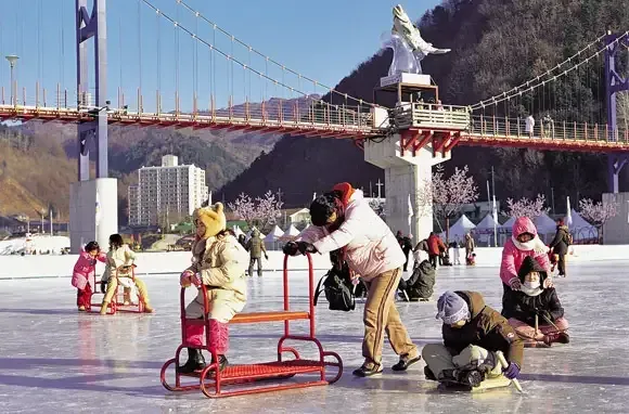 South Korea's first area to freeze over is always Hwacheon, where the river's ice reaches a solid 16 inches thick by January—ideal conditions for trout grabbing, the Hwacheon Sancheoneo (Mountain Trout) Ice Festival's most popular pastime. Shouts of joy ring out at random across the crowded ice: "I caught it!" every time a festival-goer reaches into one of the 11,000 ice fishing holes and pulls out a fish bare-handed from the clear, cold waters. Each day of the festival, 32 tons of mountain trout are released beneath the ice for the grab. Still, catching one takes a bit of luck and nimble skill in numbing conditions. If it's a bust, you can sample trout grilled or raw before getting in on a game of ice soccer, Nongmokjangchigi (mini ice hockey), or one of 38 other activities.